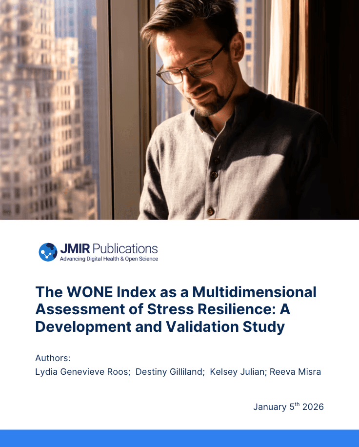 Validation of the WONE Index was published in the Journal of Medical Internet Research (JMIR), establishing the world’s first integrated measure of stress resilience. In a two-phase study (N=1,311), the Index demonstrated strong reliability (0.90) and outperformed established tools, providing a validated foundation for organizational stress-risk measurement.